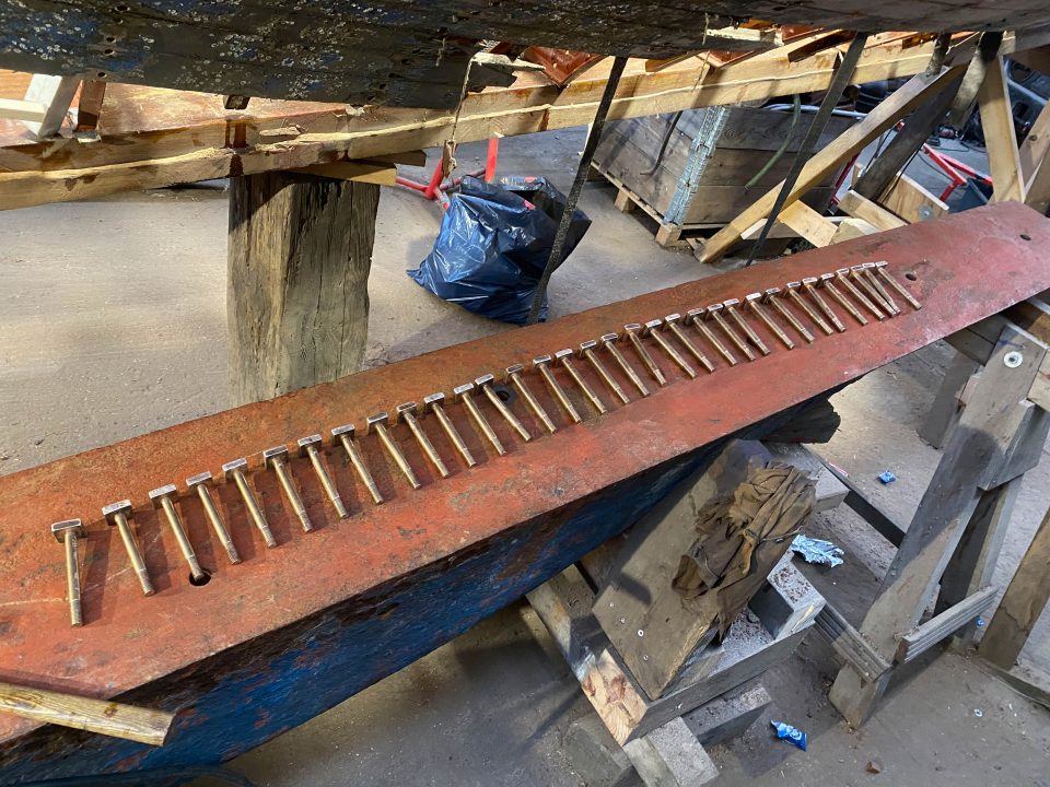Nun ist der Moment gekommen, die Bodenwrangen und die bisher nur provisorisch verschraubten Spanten endgültig mit dem Kielholz zu verschrauben. Wir haben dazu Bronzebolzen angefertigt sowie aus Bandmaterial Bronzemuttern, die …